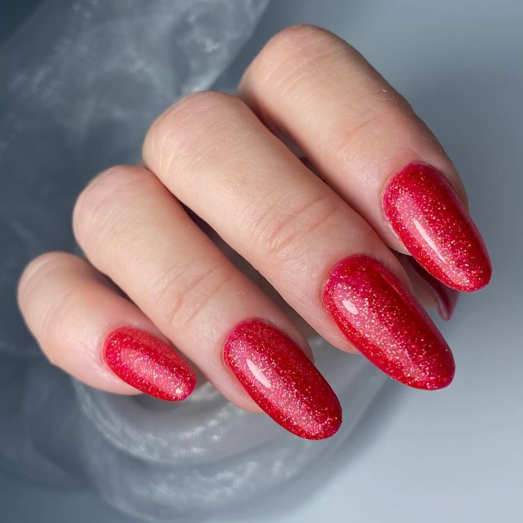 Rosa Glitzer UV Farbgel für Nägel mit holografischem Effekt.